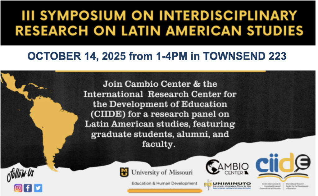 The Cambio Center is pleased to partner with the International Center for the Development of Education (CIIDE) for the 3rd Annual Symposium on Interdisciplinary Research on Latin American Studies: Tuesday, October 14th, 1-4 pm, in Townsend Hall 223 or via Zoom. For more information or the Zoom Link, please email cambio@missouri.edu.